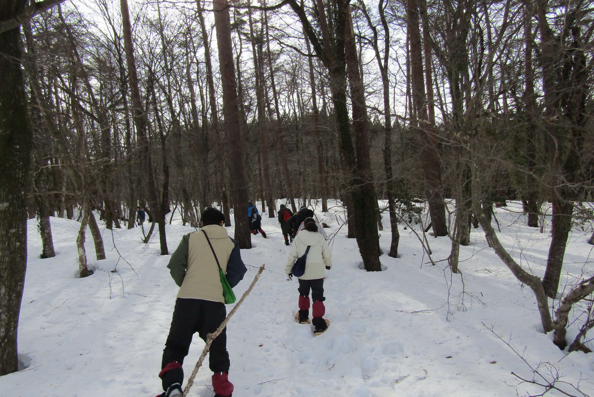 深雪の中、スノーシューを履いて自然を感じながら参加者皆で歩きました。