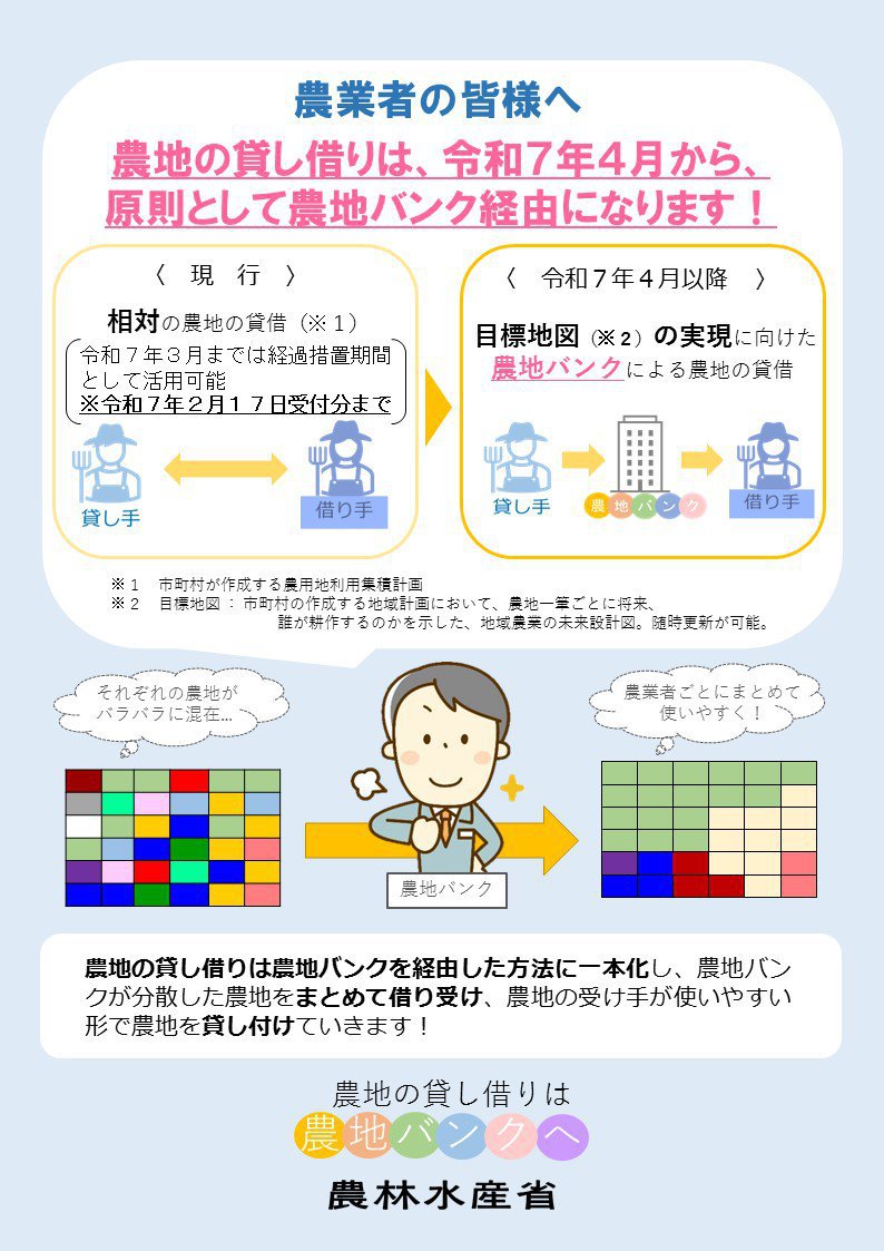 農地の貸借については、令和7年4月以降は原則、鳥取県農業農村担い手育成機構を介した手続きとなります。