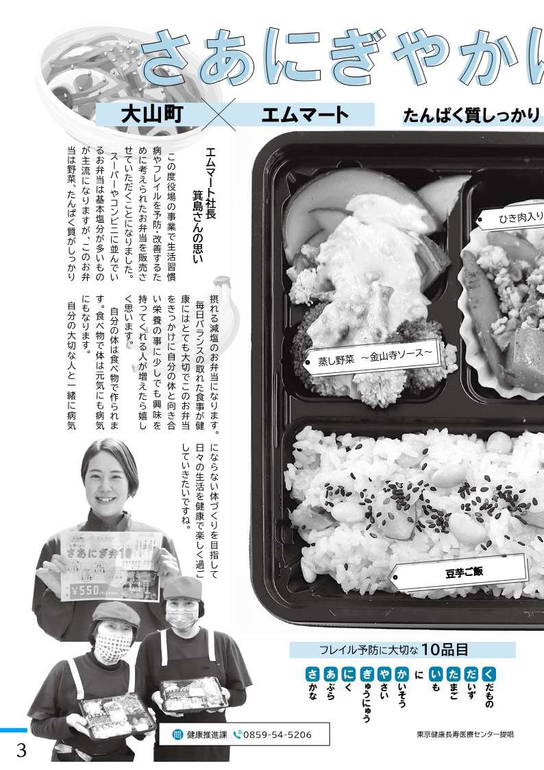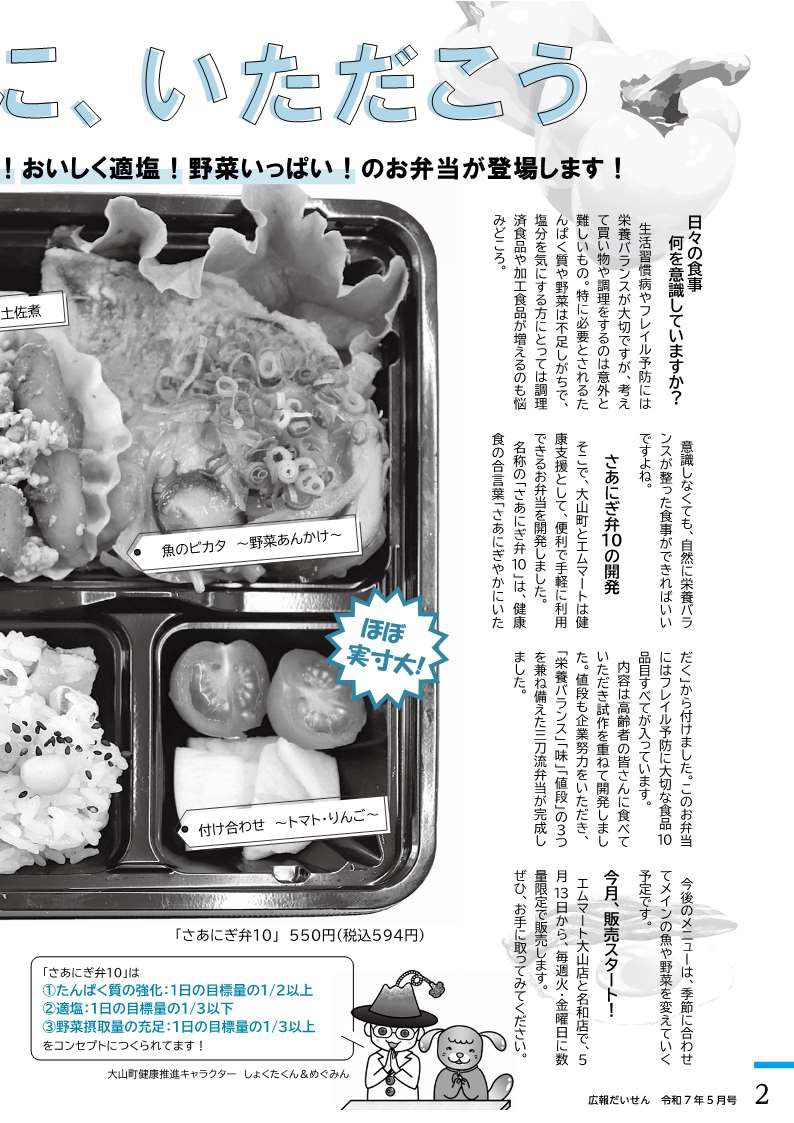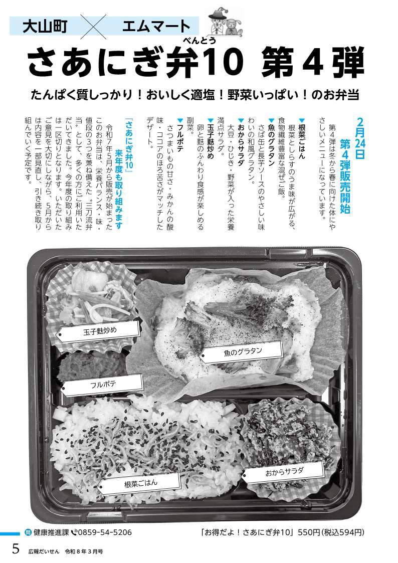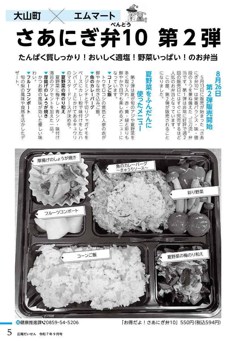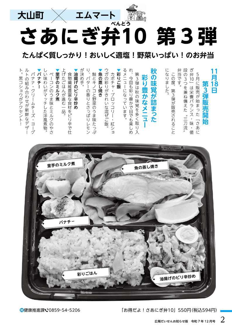 令和7年度から、大山町では住民の皆さまが日常生活の中で無理なく健康的な食事を選べる環境づくりを目的として、地域の事業者と協力し“さあにぎ弁10(健康に配慮した弁当)”を提供する取り組みを行っています。栄養バランスや塩分量などに配慮しながら、おいしく、続けやすいお弁当を地域の店舗で販売しています。