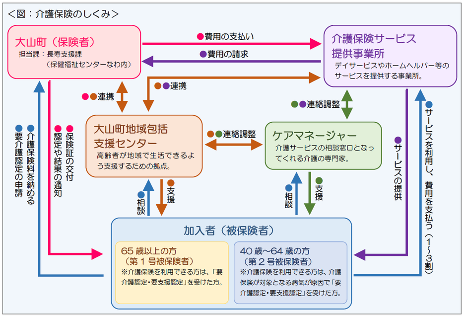 介護保険制度は、町が保険者となって運営しています。40歳以上のすべての方が被保険者となって保険料を出し合い、介護が必要なときに要介護認定を受けて介護サービスを利用する制度です。